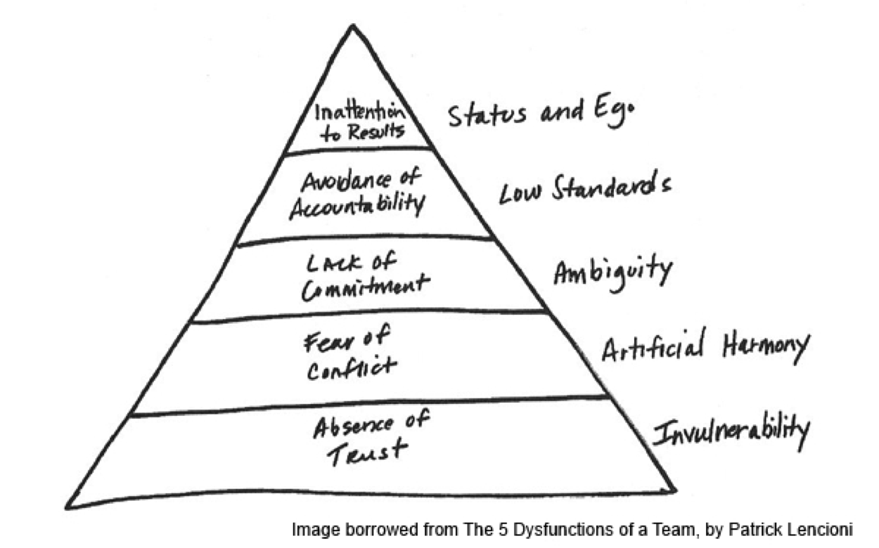 De forma muito resumida, o que esse esquema sustenta é que a base de toda disfunção de uma equipe está na falta de confiança. A lógica do autor é que, sem confiança, cria-se um clima artificial de harmonia, pois os reais problemas não são trazidos à tona. Isso, por sua vez, gera falta de comprometimento, que leva a uma redução dos níveis de qualidade e, por último, produz desatenção e perda de foco.